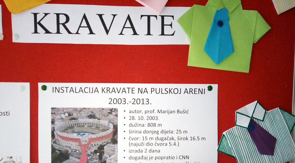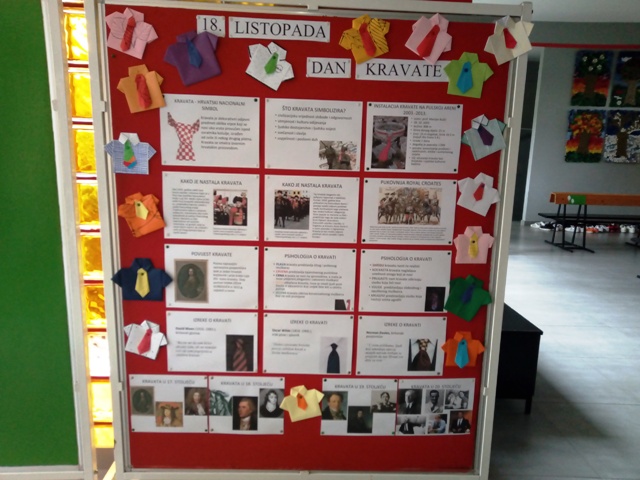 Dan kravate obilježili smo 18. listopada 2020 godine. Svi su učenici toga dana u školi nosili kravate, a u predvorju je postavljena izložba. Izložbu su uredile profesorice hrvatskog jezika, Blanka Smičiklas Basar i Tajana Sentigar Pogačić. Izloženi su likovni radovi učenika 5.a i 5. b razreda popraćeni fotografijama i tekstovima o kravati i njezinoj povijesti. Saznali smo da je kravata nastala od marame oko vrata koja je bila dio tradicionalne odore hrvatskih vojnika u 17. stoljeću. Mogli smo pročitati zanimljivosti iz psihologije o nošenju kravate, kao i izreke nekih poznatih ljudi o kravati. Tako je, na primjer, irski pjesnik i pisac Oscar Wilde rekao: „Dobro zavezana kravata prvi je ozbiljan korak u životu muškarca.“