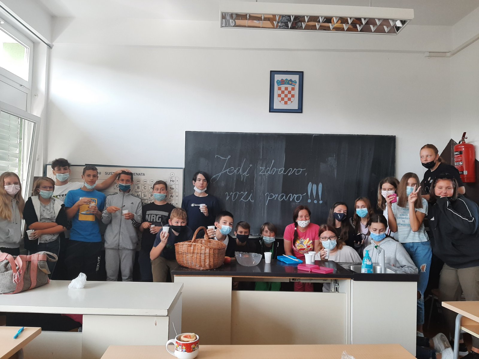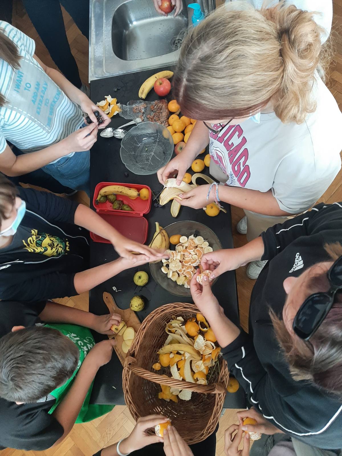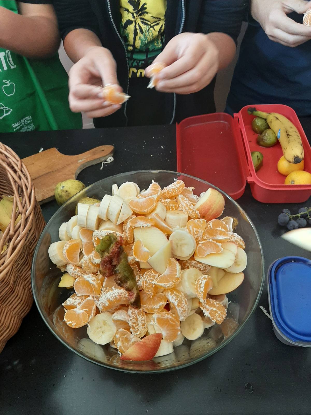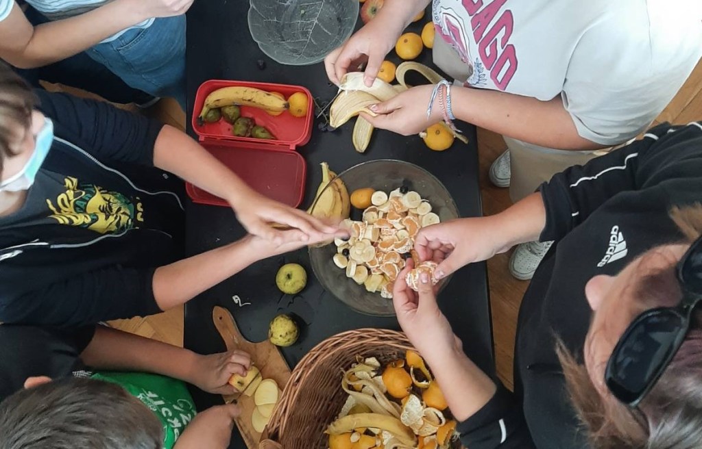 Prvi zadatak im je bio donijeti voće u školu. Naravno, što više domaćeg voća, to bolje. Učenici su ozbiljno shvatili zadatak te su donijeli raznovrsno voće. Tu su se mogle naći domaće jabuke, grožđe, neretvanske mandarine, bademi, smokve te banane koje nisu domaće, ali su jako fine i zdrave. Voće su oprali, očistili i narezali u zdjelu. Kore i ostatke voća nisu bacili nego su ih na prijedlog razrednice Mirjane Erdeljac Cunhe skupili u košaru i odnijeli u kompost.