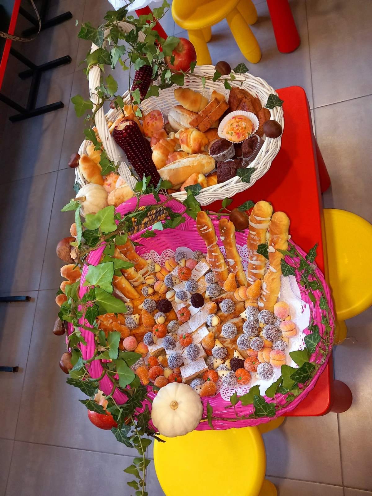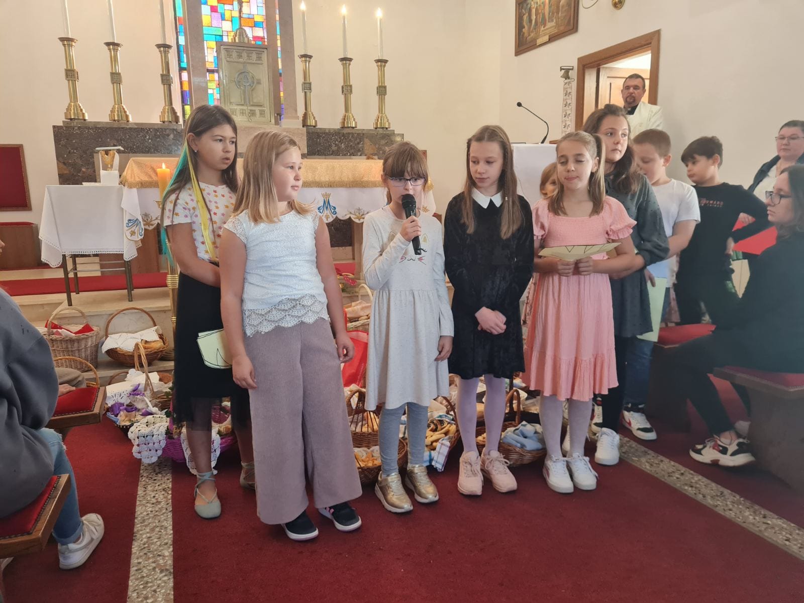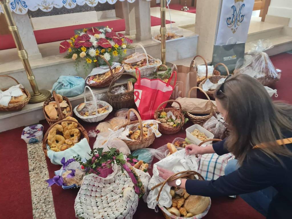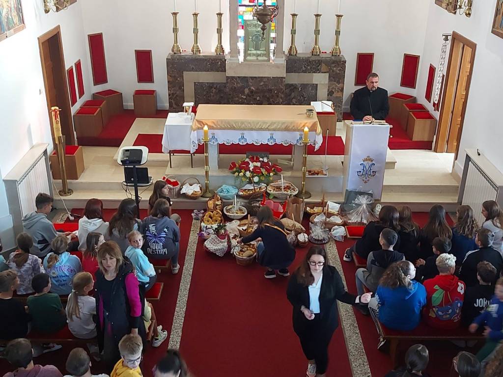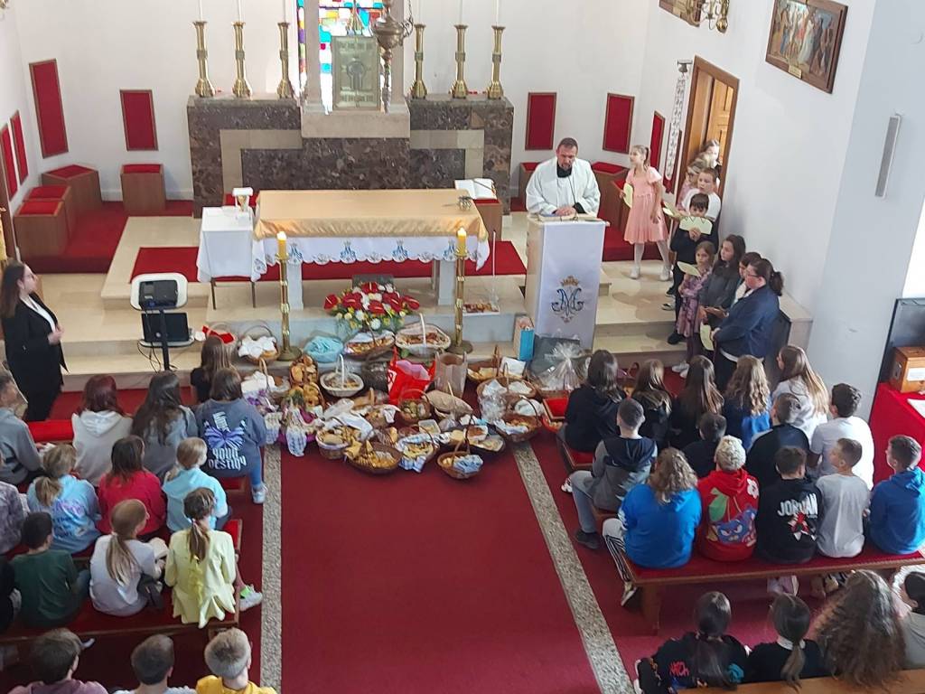 Zahvaljujući našim majkama i bakama nitko nije ostao gladan! Svaki razred imao je dvije košare pune slatkih proizvoda poput kiflica, muffina, štrudla, kolača i ponajviše kruha. U crkvi je svećenik Željko Nestić blagoslovio nas i hranu.