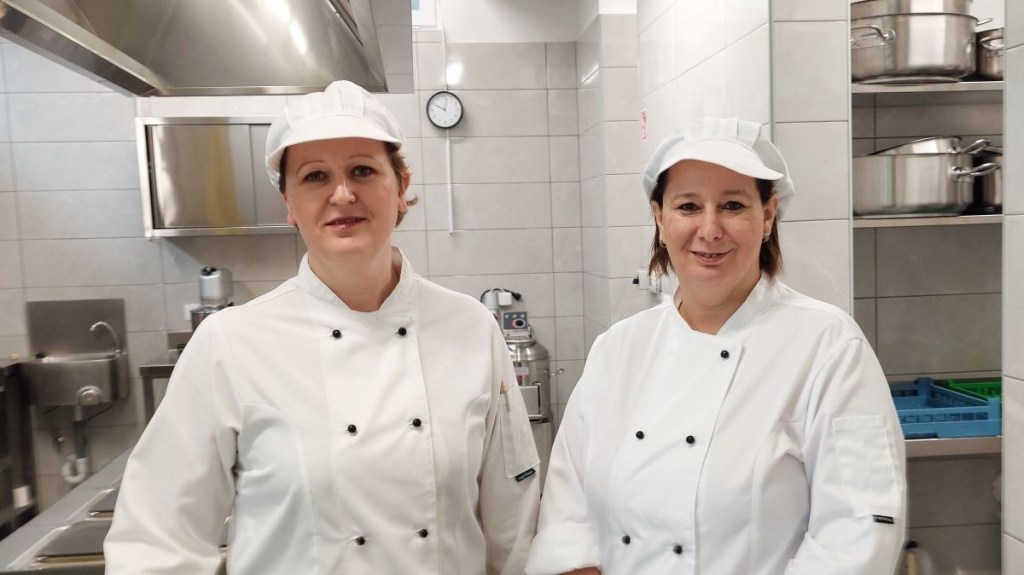 Nikolina i Barbara počinju s radom u rano jutro, u 6 sati, kako bi sve stigle pripremiti. Kažu da je priprema u kuhinji jako važna. Inače, ako organizacija nije dobra, u kuhinji neće biti dobro. Nikolina je prije radila i bila voditeljica kuhinje. Ima 24 godine staža. Radila je u hotelu te ima dosta iskustva i ovo joj nije ništa novo i neobično. Barbara je pak radila u restoranima u Karlovcu i hotelu Marche, isto tako radi preko 20 godina u kuhinji. Za njih dvije kuhanje za 300 učenika uopće nije veliki zalogaj. Obje se slažu da je čak i lakše kuhati velike, nego male količine. U vezi opreme u kuhinji komentari su bili pozitivni. Međutim, kao profesionalke smatraju da ima i nekoliko nedostataka, no spremne su se prilagoditi. Kažu da su se jako lako naviknule na novi posao. Naravno, imale su obuku o korištenju nekih uređaja. Kuhaju i za učenike u produženom boravku.