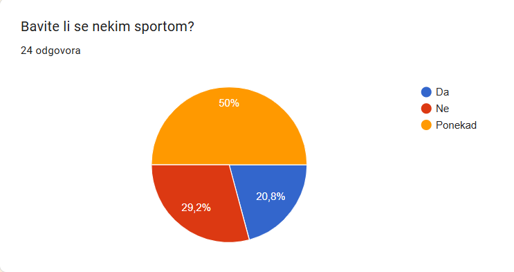 U našem je ispitivanju sudjelovalo 24 učitelja. Rezultati pokazuju da se sportom redovito bavi 20,8 % učitelja, polovica se bavi povremeno, dok se 29,2 % ne bavi sportom.