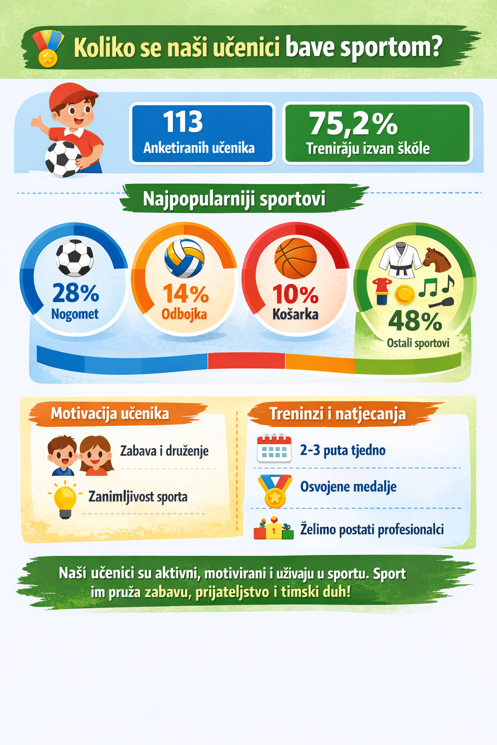 Najpopularniji sport među našim učenicima je nogomet (28%), slijedi odbojka (14%) i košarka (10%). Osim toga, učenici treniraju i rukomet, atletiku, gimnastiku i ples, a tu su i borilački sportovi poput juda i taekwondoa, te sportovi poput jahanja, hokeja i streljaštva.