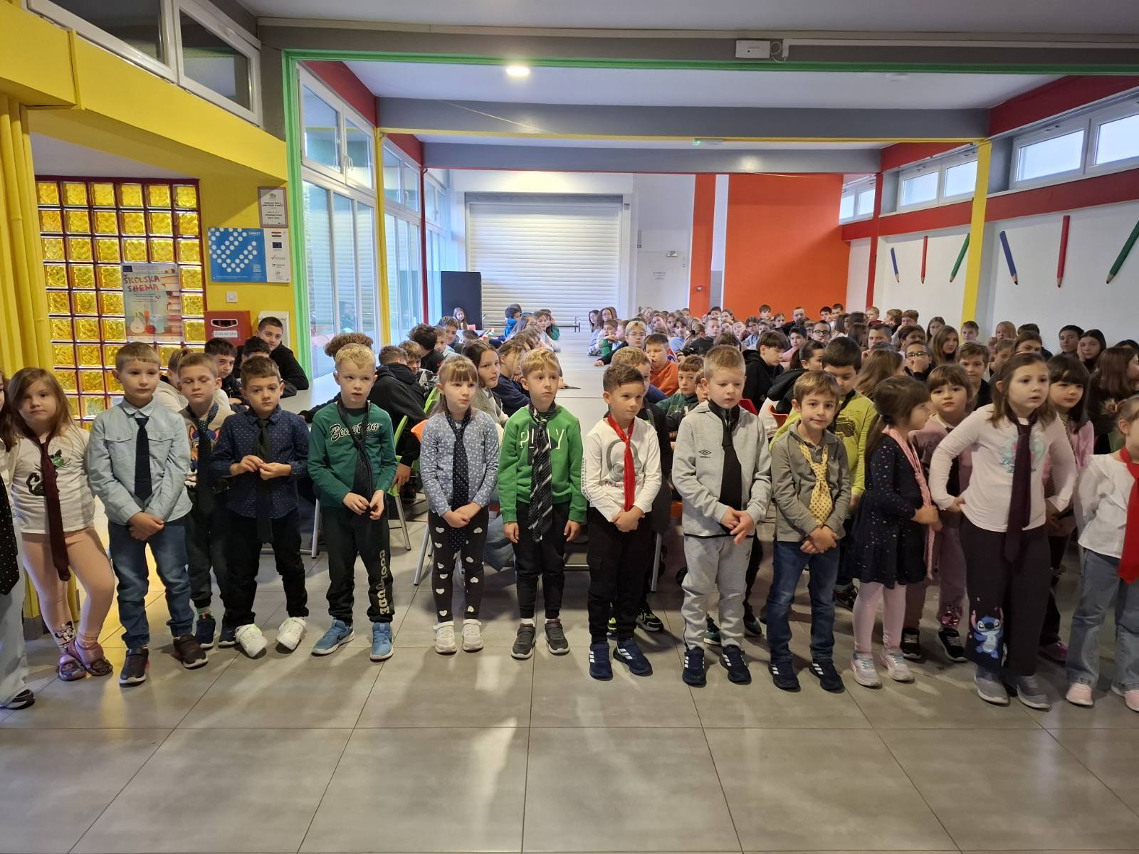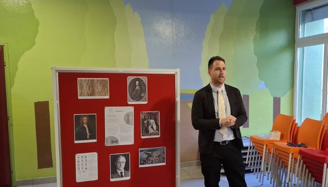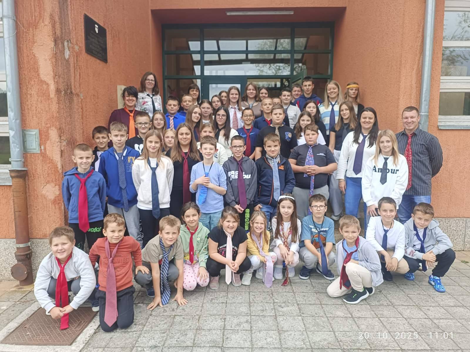 U ponedjeljak 20. listopada na pročelju škole visjela je velika crveno– bijela kravata jer smo obilježavali Dan kravate. Učenici su se okupili u predvorju škole. Profesor engleskog jezika Leno Erdeljac pokazao nam je na koje se sve načine može vezati kravata, a profesor povijesti Marin Bolić objasnio je kako je zapravo nastala kravata, još u 17. stoljeću. Kada su muškarci odlazili u rat, žene su im vezale rupce (kravate) oko vrata. Hrvati koji su se borili u francuskoj vojsci nosili su takvu maramu u Tridesetogodišnjem ratu kako bi ih njihovi vojnici mogli prepoznati. Taj „modni detalj“ francuski je dvor, posebno kralj Luj XIV., počeo nazivati à la croate (na hrvatski način), što je kasnije dovelo do naziva “cravate”.