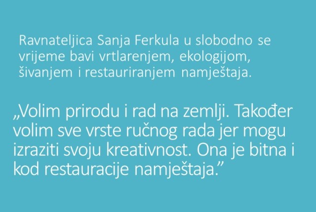 Ravnateljica Sanja Ferkula u slobodno se vrijeme bavi vrtlarenjem, ekologijom, šivanjem i restauriranjem namještaja.
