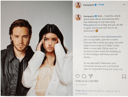 Super zvijezda nekadašnjeg boy banda „One Direction“, Liam Payne, potvrđuje da snima novi božićni hit s TikTok zvijezdom, glumicom i pjevačicom Dixie D’Amelio. Pjesma se zove ‘Naughty List’, na hrvatskom ‘Nestašni popis’. Obožavatelji TikTokerice i pjevača već se dugo nadaju njihovoj suradnji i pretpostavljaju da se nešto događa, ali je sada i sam Liam potvrdio o čemu je riječ.